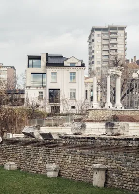 Prior to its reconstruction, this house from the 1920-ties was a romantic ruin surrounded by authentic and new-built fragments of ancient Augusta Traiana and rather isolated from the contemporary city, yet in its very center.