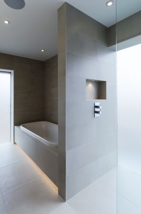 The dining area is located to take advantage of views to both the front and rear gardens. A study/gym and utility room within the boundary of the existing house complete the accommodation at ground floor level. A substantial roof-light over the stone clad island unit lights the kitchen from above.