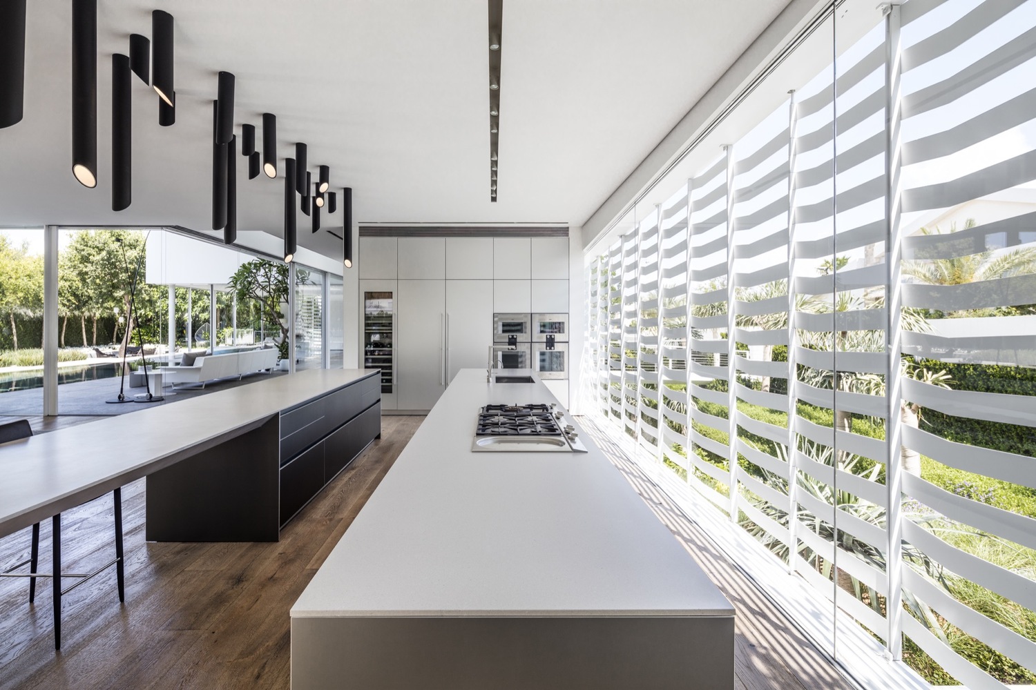 It showcases the fallen garden whose greenery embellishes the intricate shadows and provides vantage to the pool, surrounding walls and outdoor lounge.