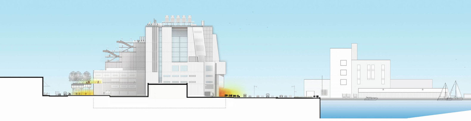 -side, with tiers of lighter terraces and glazed walkways stepping down to the High Line, embracing it into the project.