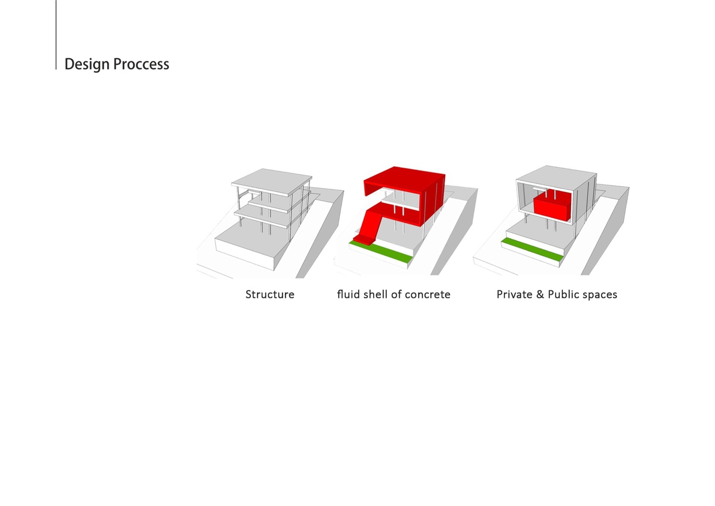 To implement integrated shell, we are looking for a material to create a sense of fluidity and in order to minimize the variety of materials used to construction elements, including exterior walls, interior walls, cover the underside of the roof, staircase and fireplaces performed by it.