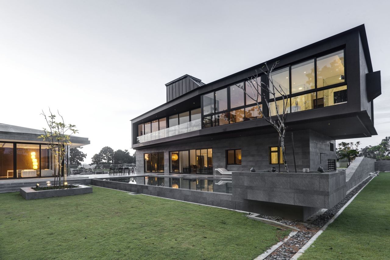 The facades are also carefully calibrated. The front facade uses operable waterjet cut panels that obscure the internal programs and minime thermal heat gain from the western sun. The rear façade facing the golf course uses sliding glass windows that frame the lush green fairways.