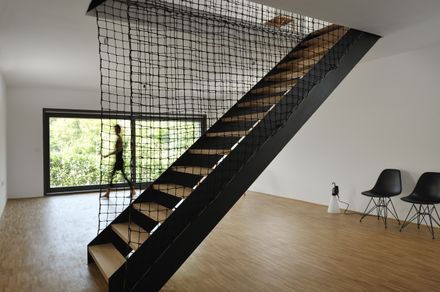 Relatively high volumes are structured with a simple architectural approach: the ground floor is designed to act as a »pedestal« of the house, supporting two smaller volumes with steep skillion roofs.