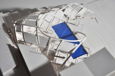 The integrated panels follow a dynamic course from the orthogonal edge into the described space, to develop in the central parts in relation to the steel structure from the inside to the outside or to dissolve more and more along the vertical.In this case architecture is an accumulation of possibilities in a described space and creates only the edges for a vast land in between.