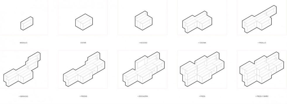 Through the configuration of spatial modules comprised of two wall panels and two split-level panels, inhabitable spaces measuring 6 square meters were built.