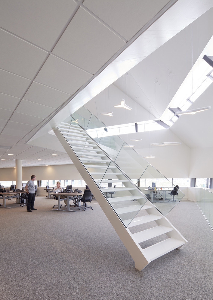 A central strip in the building contain most of the meeting spaces, toilets elevator and other necessities. Stairs have been places in and near the voids to encourage the use of stairways and to enjoy the spatial effects of the skin. The new building is a daring and powerful statement answering the demands of the global operating company.
