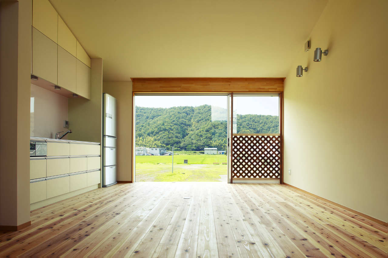 This is a small house for a young couple in Obama, Fukui, Japan. There is a vacant lot around the site. So, by creating a large window on the second floor, it is possible to see paddy fields, mountains, sky and feel to spread over a floor area.