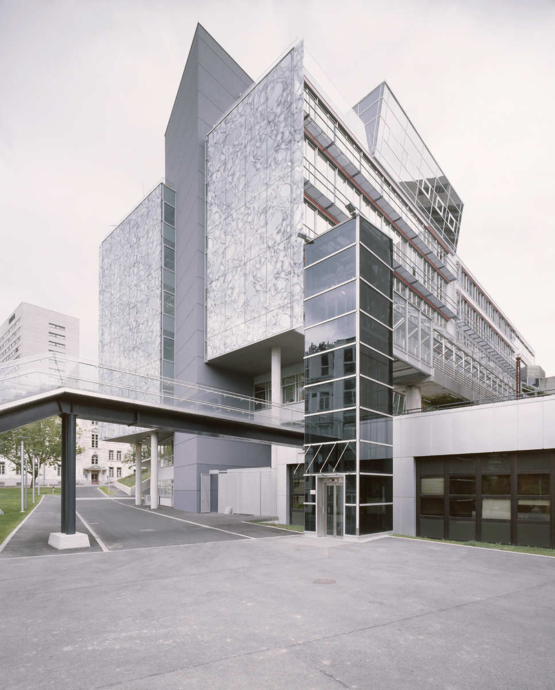 Due to the urban-development location right at the hub of the exactly-arranged axis system of AKH and Spitalgasse, a street heading North-East with a slant, to which the entire Eastern area with its 1910 buildings bears reference, the Eastern facade of CeMM has seen consistent moulding-into-shape, further emphasized by the superstructure imposed on an existing air-intake building.