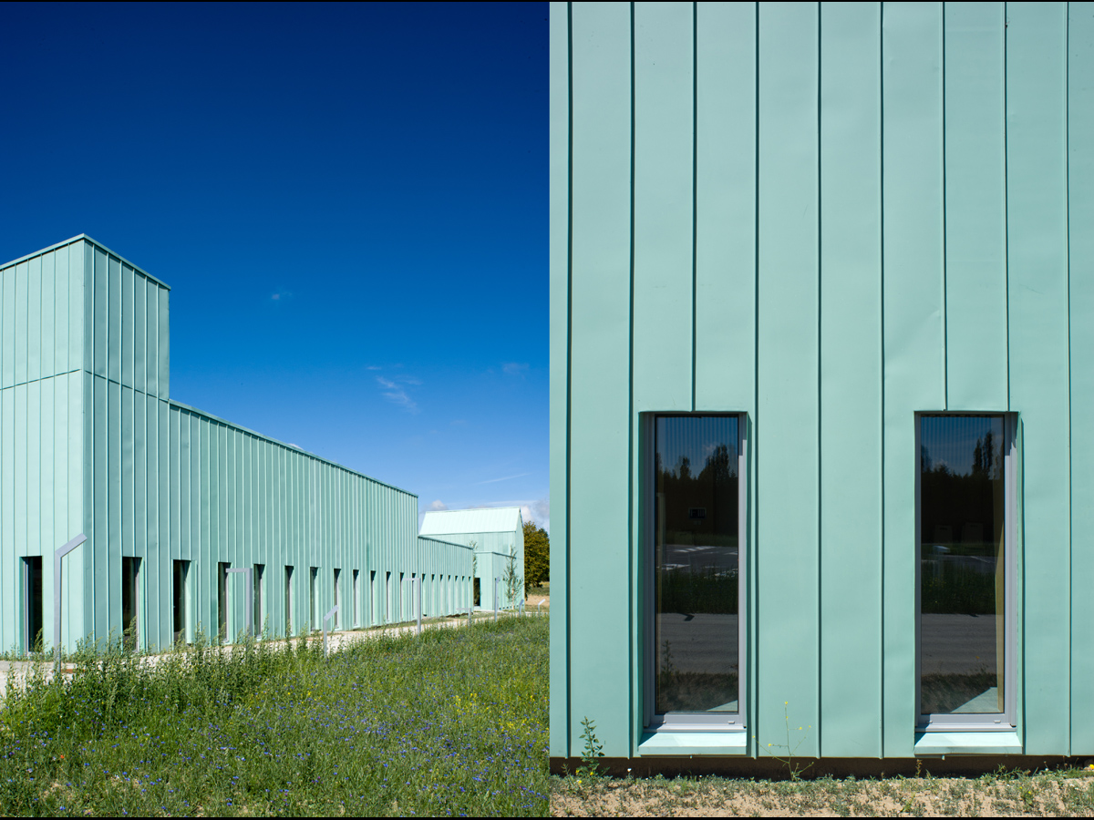 Hidden by the terrain, the building borrows from the surrounding rural farms, barns, and small factories and translates them into a contemporary language.