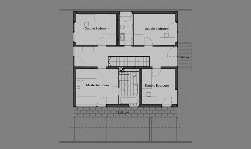 The upper floor consists of four bed rooms and two bath rooms, a south facing balcony and the balcony above the entrance. There is a provision for a future external stair leading up to a roof terrace.