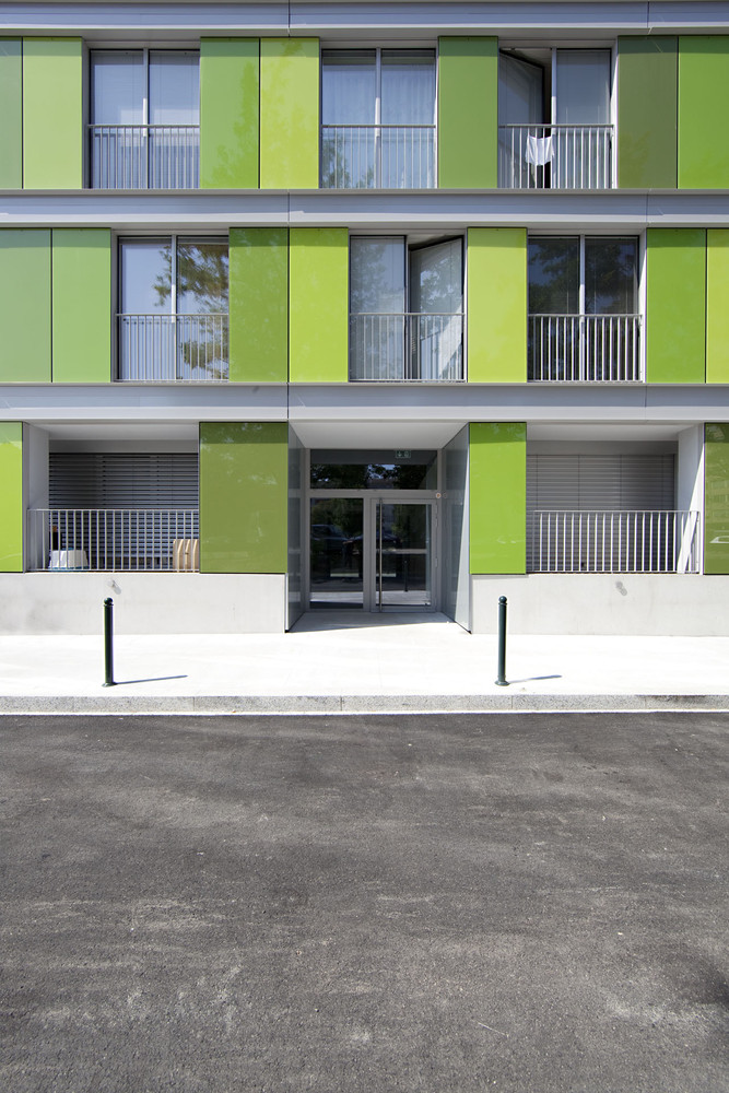 Inspired by a theme of vegetation, tinted glass panels randomly create a mosaic consisting of 5 different shades of green and help give a vibrant aspect to the facades.