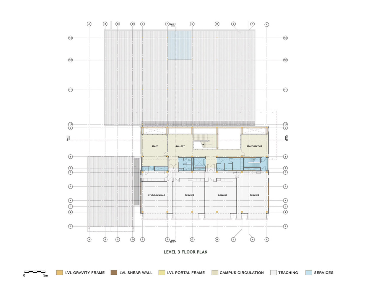 As an educating tool, the timber structure is made legible, all timber members are exposed and their function expressed. Material finishes and surfaces are described in the manner of a drawing legend, either as clear finished structural timber or an applied lining.