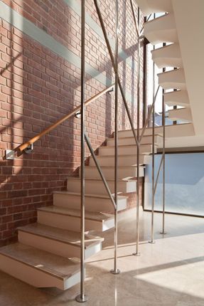 The limestone floors in the interior are highly polished to reflect light, contrasting against the exposed brick walls. The pleated concrete stairs, floating in the double height volume of the public rooms, have railings that are crafted in stainless steel pipe. The electrical and air-conditioning services are routed in vertical shafts located on the exterior walls, facilitating ease of maintenance.