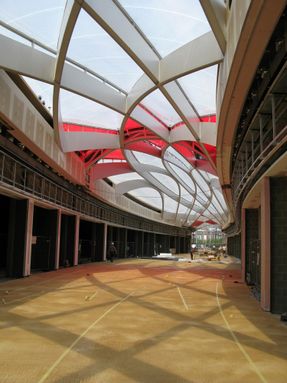To minimise loadings, the complex three dimensional structure is clad in transparent lightweight ETFE - pneumatic Texlon cushions which allow light to penetrate the roof while moulding themselves to the irregular structure.