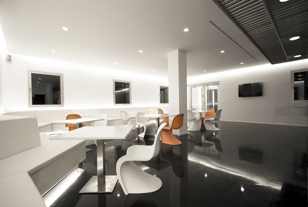 The bent geometry generates niches in the lounge, which serve as seating areas for the guests. Only the orange chairs and an illuminated rear kitchen wall add colour accentuations in the room.
