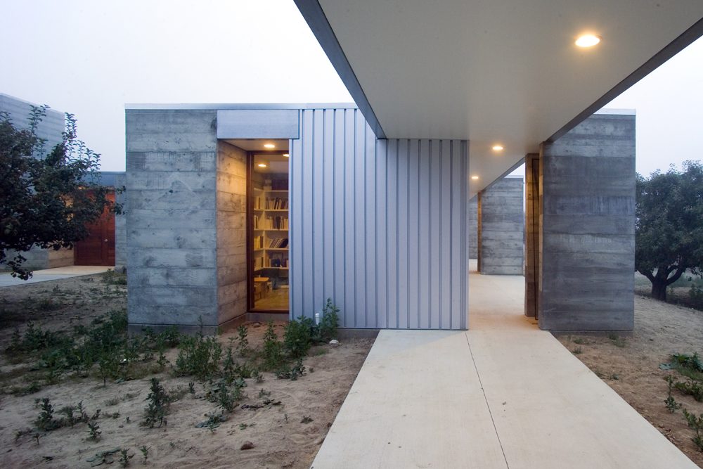 The house is a low, single story volume, wheelchair accessible throughout, built with a minimal range of materials: heated concrete slabs, raw concrete primary walls inside and out, with secondary walls and ceiling clad in white drywall on the interior, with galvanized steel on the exterior.