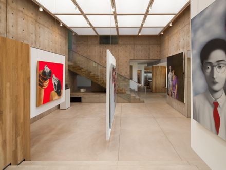 Gallery Four’s specific shape accommodates the famous 30 foot long Murakami painting; "Supernova" is naturally lit from a parallel clerestory above which gathers north light to reflect off of the opposite white bulkhead.