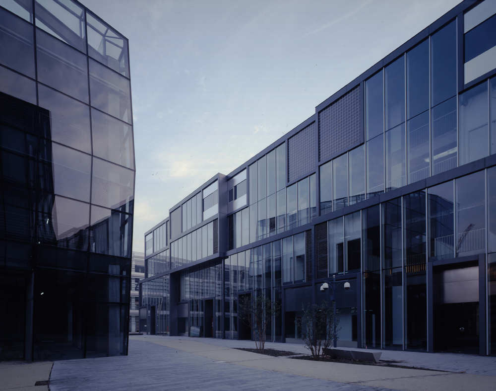 The first and second floors are for commercial purposes, and the third and fourth floors are for office functions, so that building programs are vertically divided in two functions. Each of eight tenants is provided with thirteen meter wide space.
