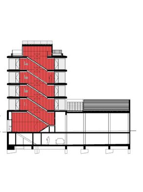 The solution has been to create a service core, running up the full height of the structure, in a building corner by the entrance terrace-hall, which will allow cross-ventilation through its openings on either side.