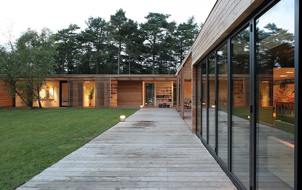 The structure is based on a timber frame with steel reinforcements, placed on a concrete slab. The roof is made with a system of laminated veneer lumber which has been tapered towards the courtyard.
