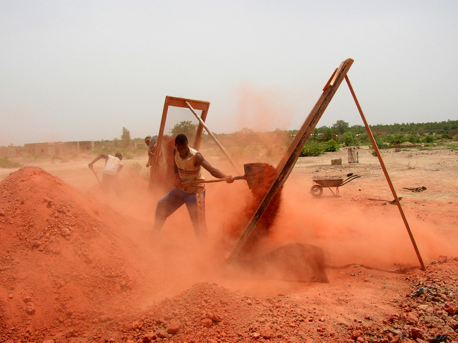 The building walls are constructed using compressed dry stacked clay bricks, BTC , made on site using a rough mixture of earth, cement and water. The bricks were baked in the hot sun, with no energy consumption, thus limiting the environmental impact of the material.