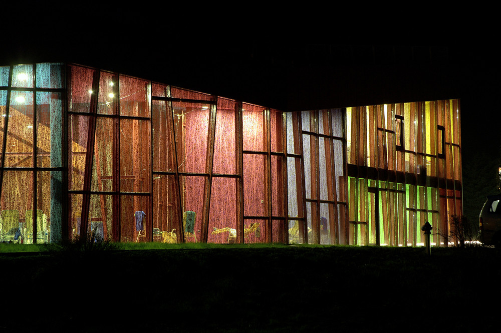 Throughout the day the object blends with surroundings trying not to be aggressive but almost like a fence, though in the evening and throughout the night when neighboring elements aren’t present any more changes face completely.