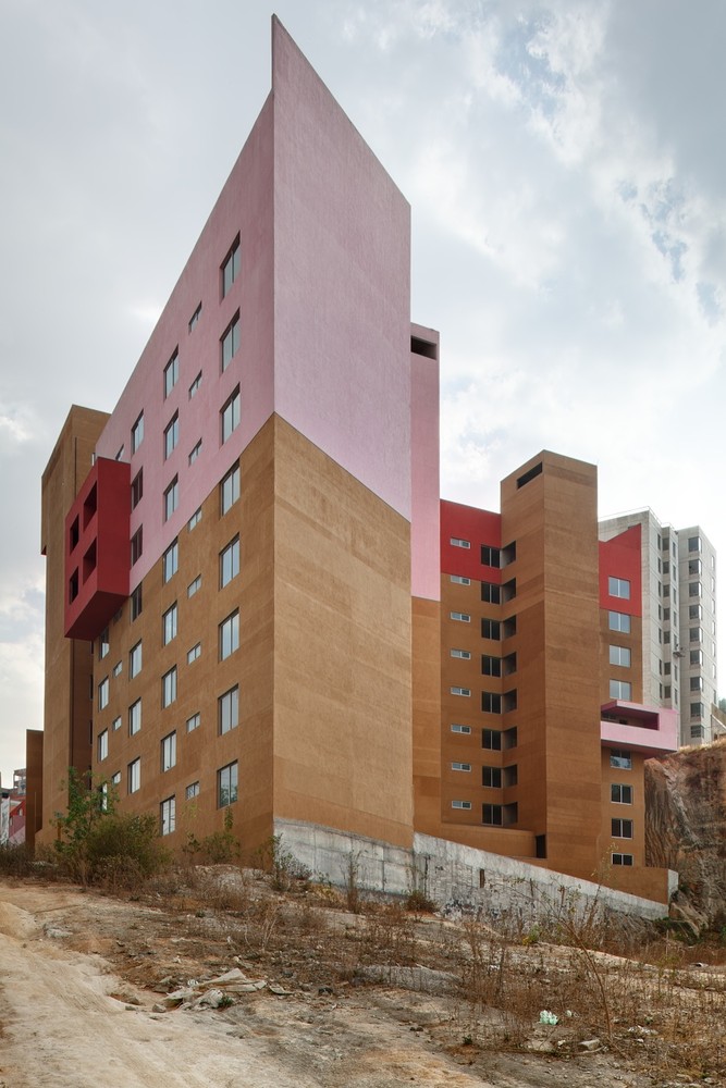 The buildings were then covered up either with natural "tepetate", pink or redish stuccos. The whole project was designed as a unified entity that is rooted, that plays around and tries to reach for the sky.