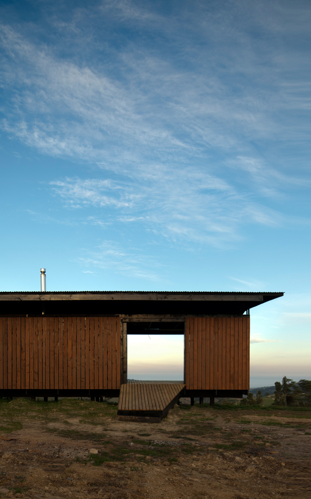 The house has an interior of 77m2 that include two bedrooms, a bathroom and a kitchen integrated to the living and dining room that communicates directly to a covered porch and a corridor that projects over the terrain in its sloping part.