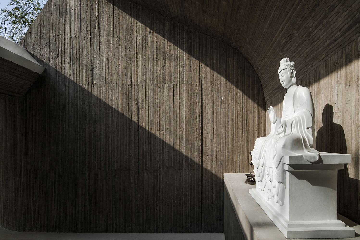The shrine is against the wall and facing the water, where the light and the shadow of the trees get through the skylight and flow into the interior space softly along the curved wall, exaggerating the light of Buddha.