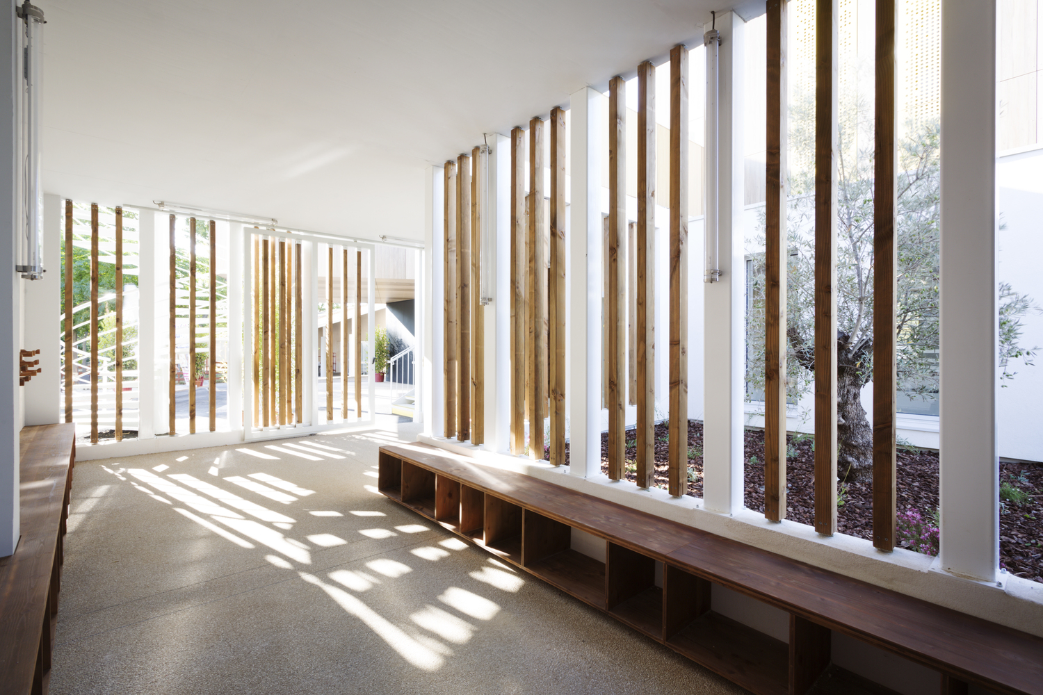 In the playground, under the imposing cantilever, an entire wall is painted with special chalkboard paint and covered in children’s drawings. Around the yard and patio, in every empty space and void plants are progressively taking over. Their colonisation is encouraged by the architects.