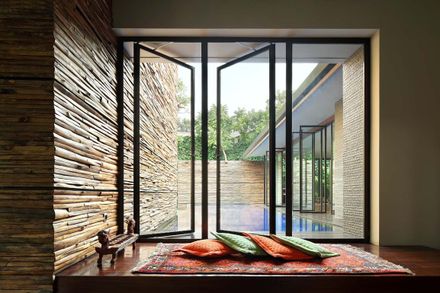 The large rooms of the house which use for everyone of the family were made with an open and transparent view so that the flow of air and the scenery which display green walls background and local natural materials could bring an impression that the room and nature are interconnected together.