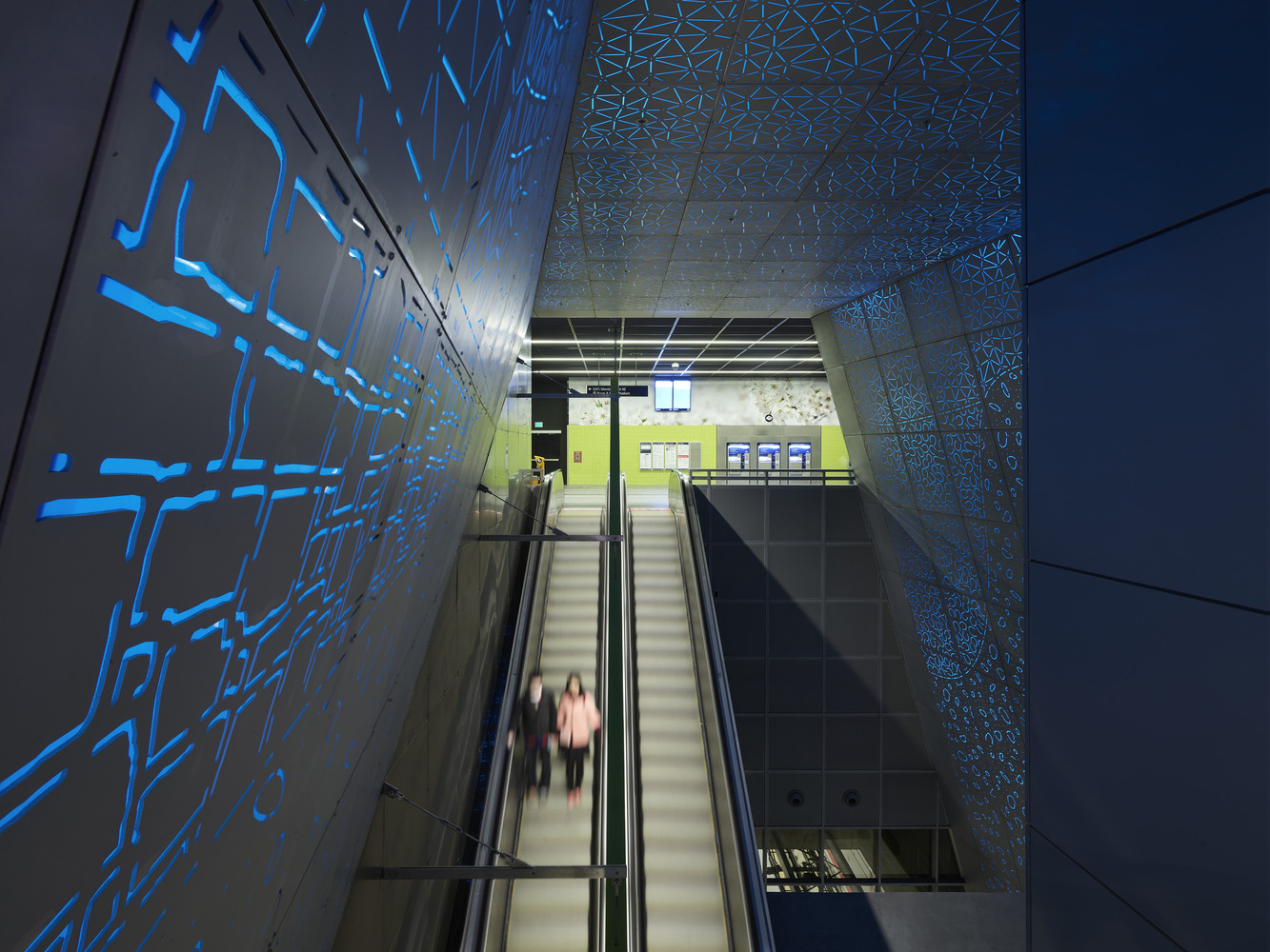 At the heart of the station experience, the escalators and glass elevator pass through a 55-foot-high central chamber, one of the tallest interior volumes in the city.
