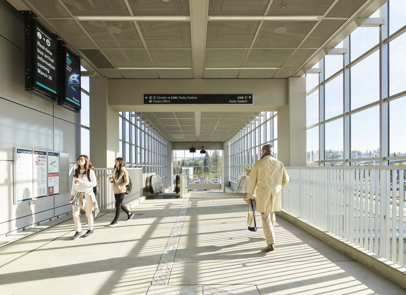 The station’s new bicycle and pedestrian bridge — with stairs, escalators and ramps connecting both levels of the entrance structure — curves gently as it spans over Montlake Boulevard to land on the university campus.