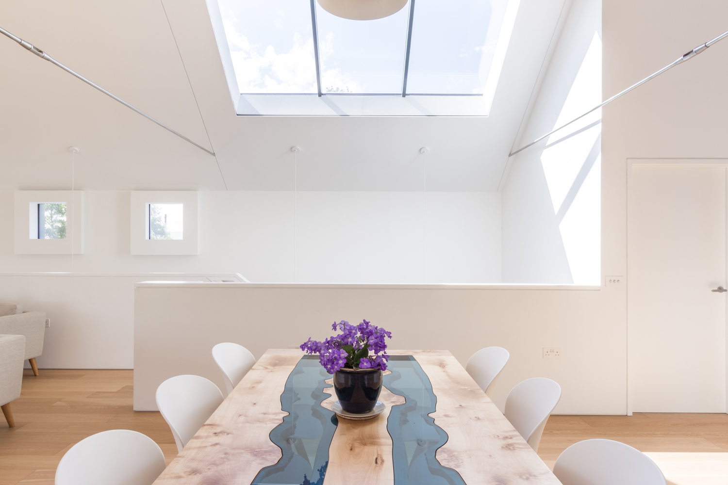 Internally the clever use of natural light and spatial contrast, combined with the warm textures of wood in contrast to clean white washed walls creates a warm and delightful space for the clients to enjoy.