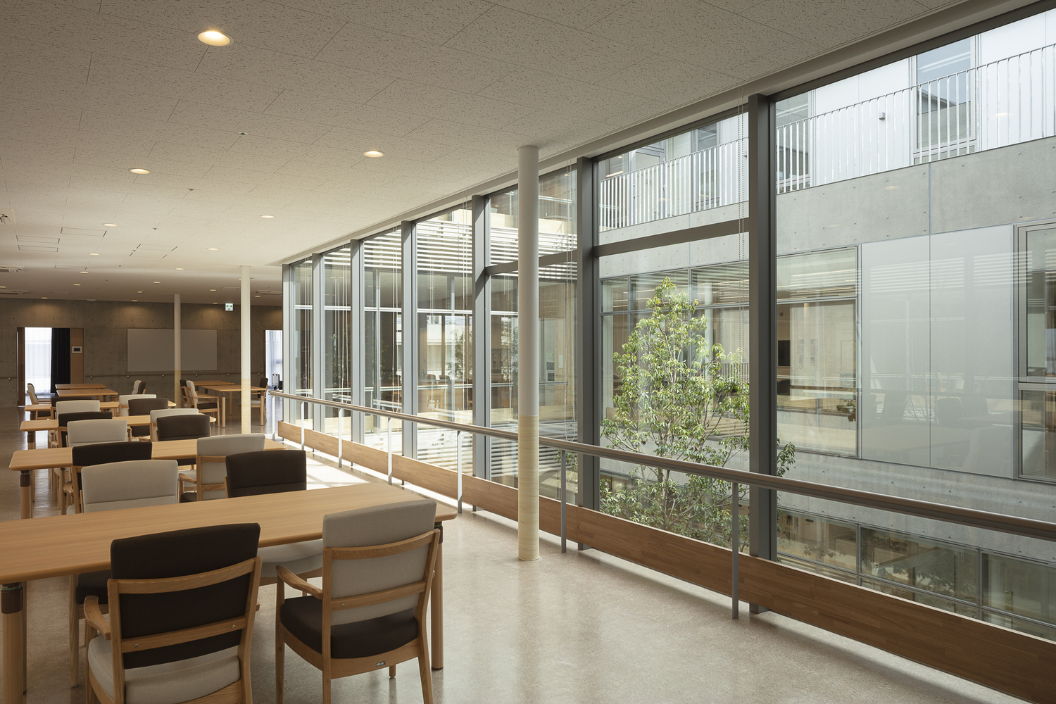 The slender steel columns inside carry only vertical loads. A wider view spreads out by a few slender columns in dayrooms, so the dayrooms and two courtyards make a deep connection. This structural design makes planning flexibility.
