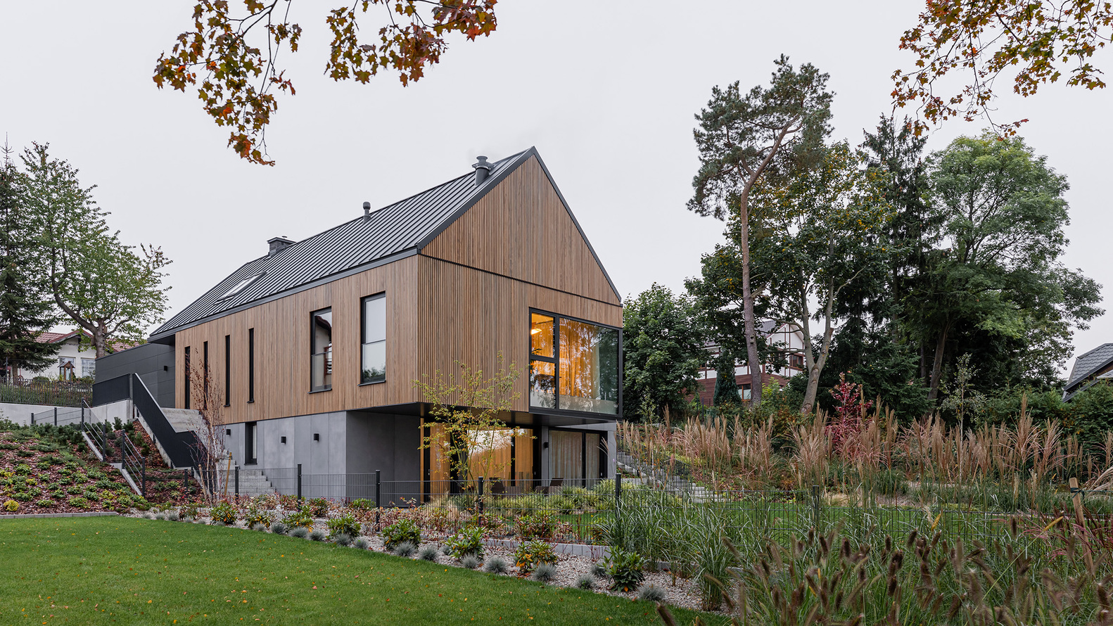 A steep slope of the plot separates the private part of the gardens from the street, creating a calm green zone overlooking the lake.