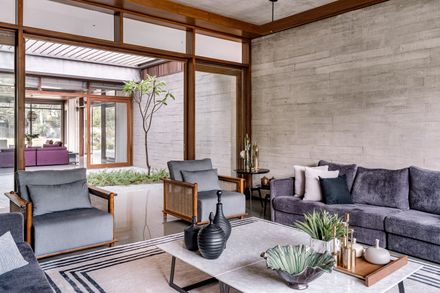 The inner court which is archtypal indian space and where living, dining and formal drawing opens, had to address issues of security, rains and dust. This security and privacy concern is addressed through wood screens that complement with exposed rcc.
