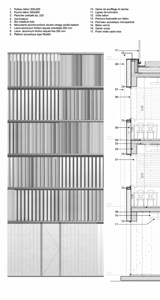 The concrete skeleton appears in traffic and is fully visible in the classrooms. Acoustic correction takes place thanks to the wooden materials added to the concrete via islets and is not managed by a simple false ceiling with no flavor.
