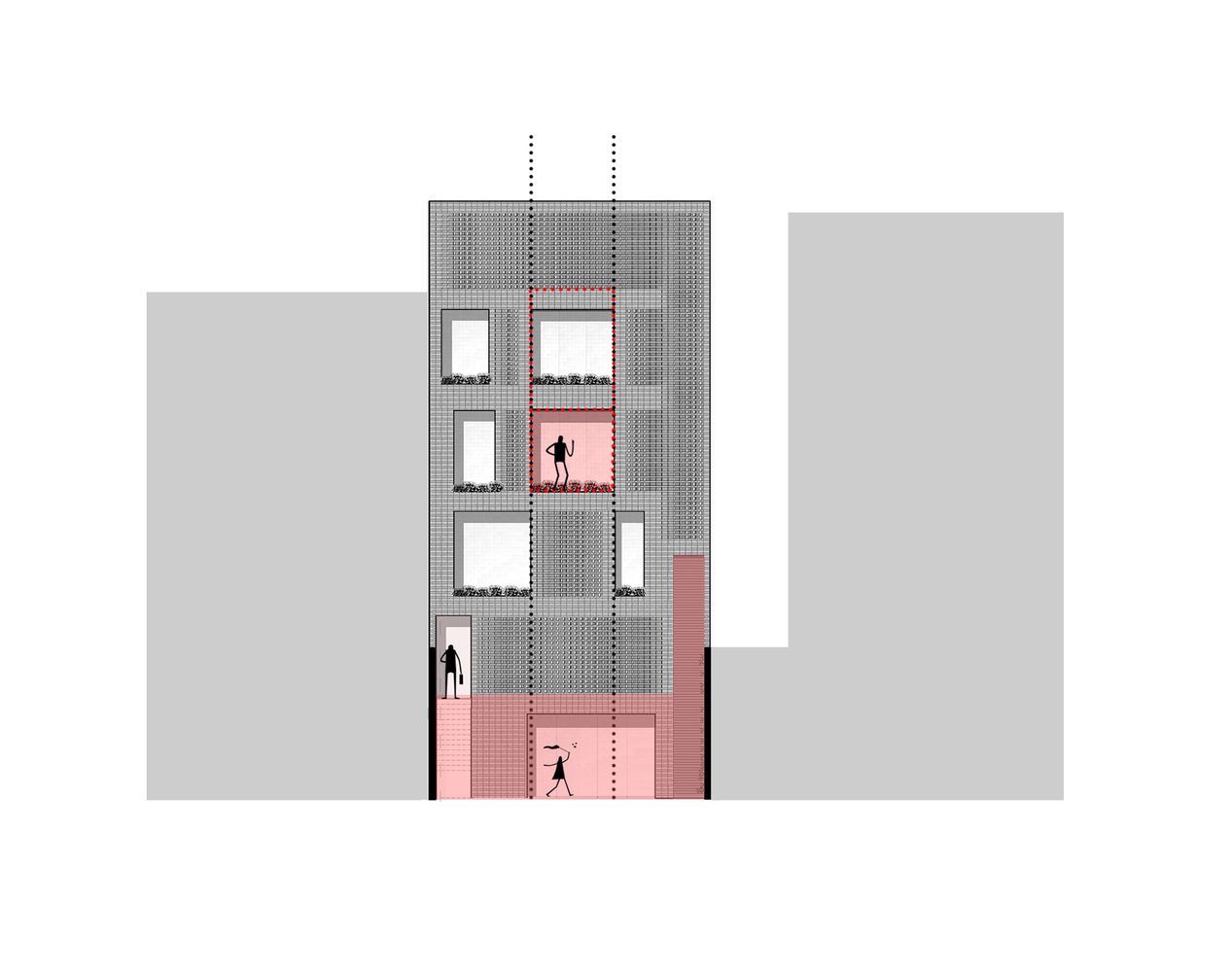 The semi open balcony is located in the middle division in both plan and section, and all the vertical circulations are placed in one division to optimize space utilization throughout the building.