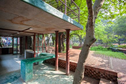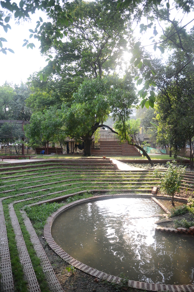 The semi-open café emerges within the gap created from the changes in topographical layers which starts from the sunken steps surrounding the water body and ends near intermediate level of a large tree.
