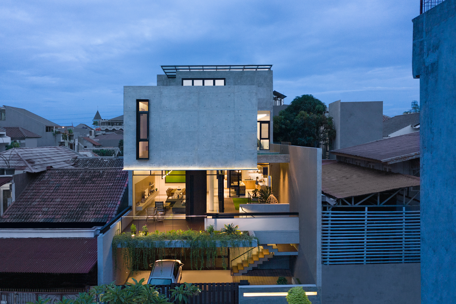 E House has 4 levels and it is built on 203 m2 land area, located in Jakarta, Indonesia. Each level has its own programming function, first level as service & office area, second level as semi private area, which has kitchen, dining area, and living room, third and fourth level as private area for bedroom and leisure activities.
