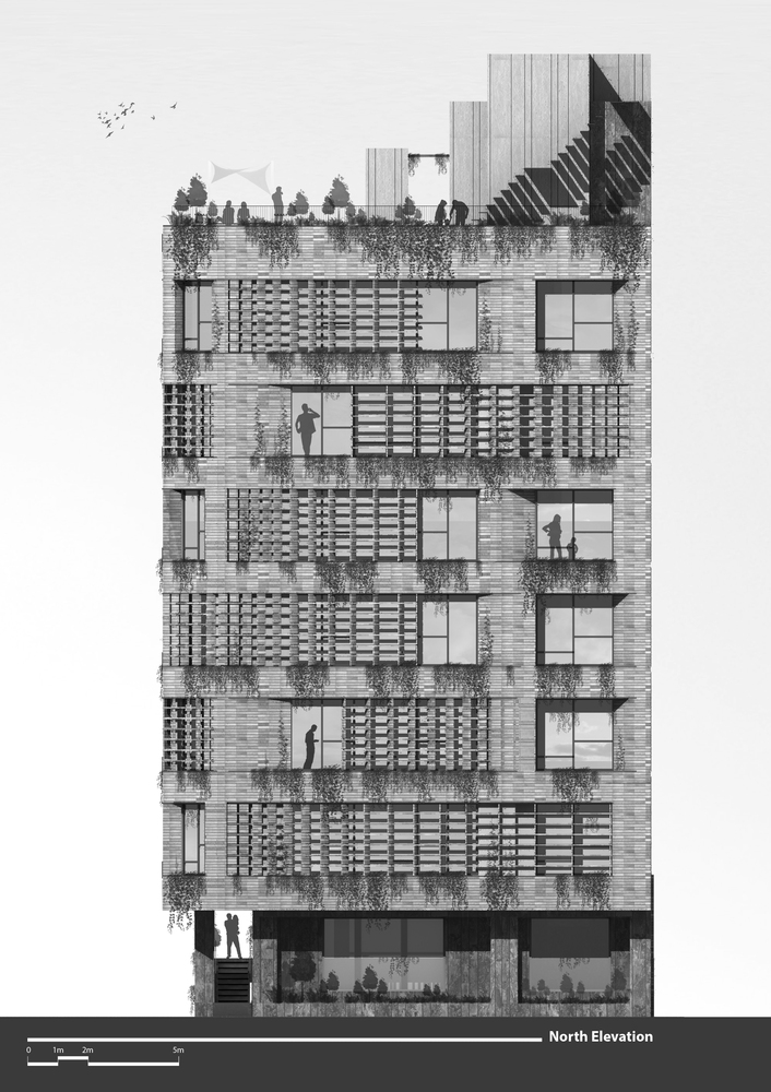 This opened-facade designed to provide greenery growth gradually toward the widest grid of facade, on the one hand by distancing finishing shell from main body of the building and on the other hand by making the grids of finishing shell of the facade, wider and wider and like was gradually rotating the elements of facade to minimize coverage.