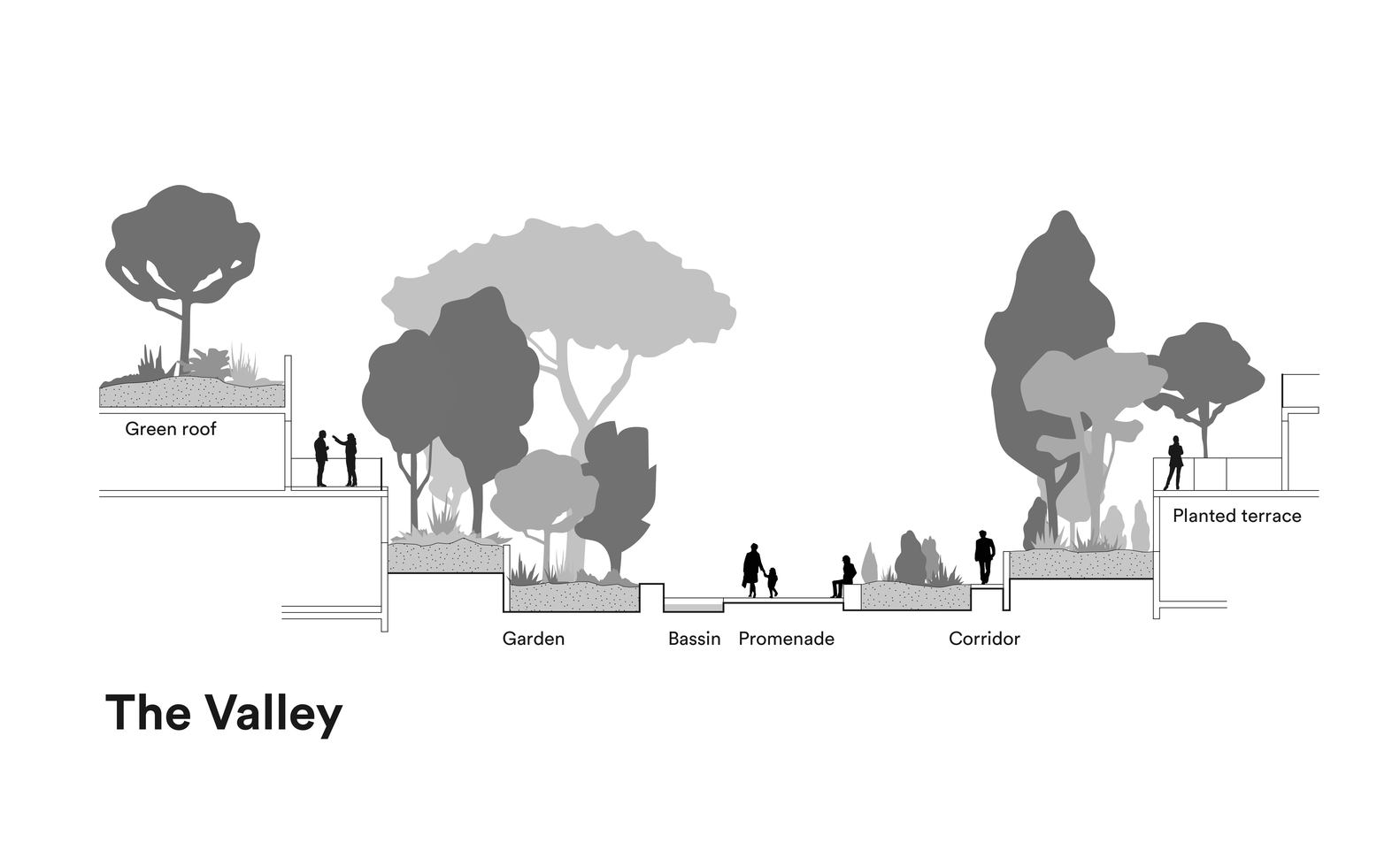 The new Prado Concorde development on the edge of the Lez river and at the entry to the town combines collective housing with school facilities and shops in a vast urban island surrounding a garden shaped like a valley.