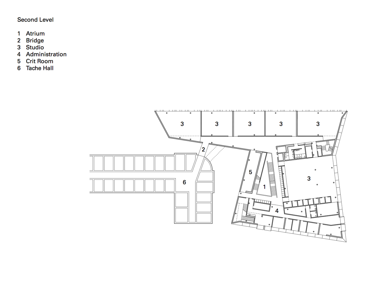 Terraced seating at the base of the atrium creates a multi-level lobby that connects these two facilities together, tying them to both at-grade and below-grade campus circulation. Studios and administration are on the upper floors to take advantage of natural light.