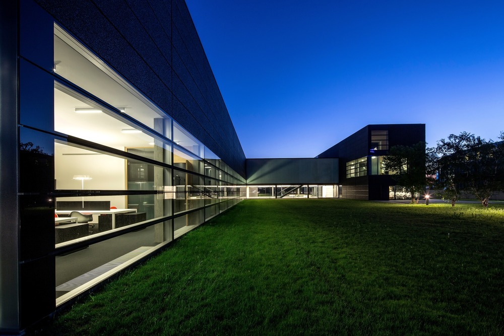 Their new headquarters are located at a boundary between an industrial area and farmland, and hence belong to both, the industrial and the natural landscape.