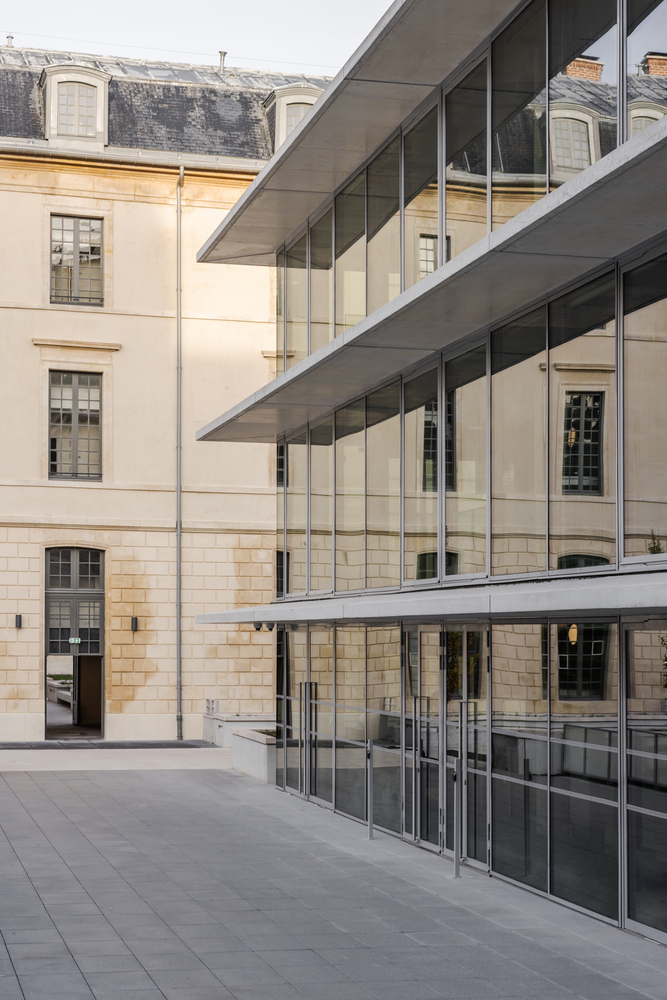As part of the conversion project developed in partnership with Wilmotte & Associés and heritage architect Pierre Bortolussi, Moreau Kusunoki focused on the contemporary extensions, namely the Pavilion and the main courtyard in relation to the underground library.