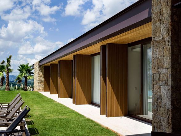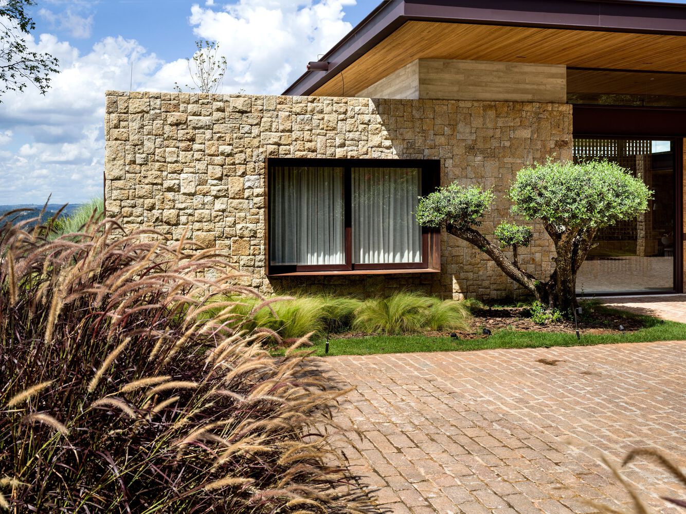 The architectural volume of the bedrooms is coated with continuous frames of slatted aluminum, reinforcing the horizontality and ensuring the privacy of these environments, with the master suite cantilevered over the slope, where the window´s large span tears the concrete façade, bringing the landscape inside.