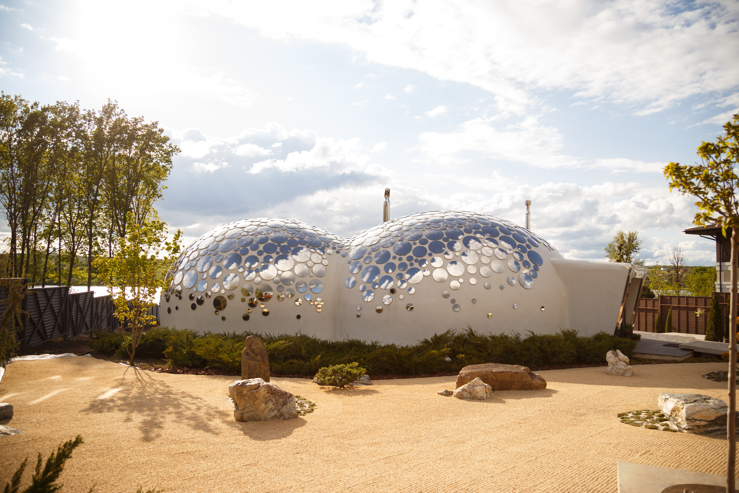 Baan Bubble dome house with a magnificent sunset & lake view, designed in the spirit of retro-futurism; a landscape with very special thematic terraces - a Chinese garden with a dragon trail, a classic Japanese Rock Garden, and Mediterranean line, where the Red Vine infinity pool is located.
