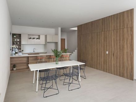 From the outside, the house aims for the plastic integration of its facade with the neighboring houses and departments: the compositive lines of each of the three levels match those in the adjacent buildings.