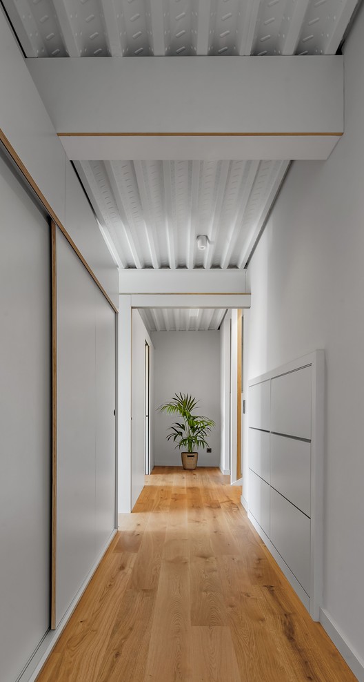 The vertical metallic structure and the sheet metal floor slabs allow to play with large spans and mid-levels. The sheet metal of the roofs acts as a light reflector, diffusing light from the facades to the interior of the house.